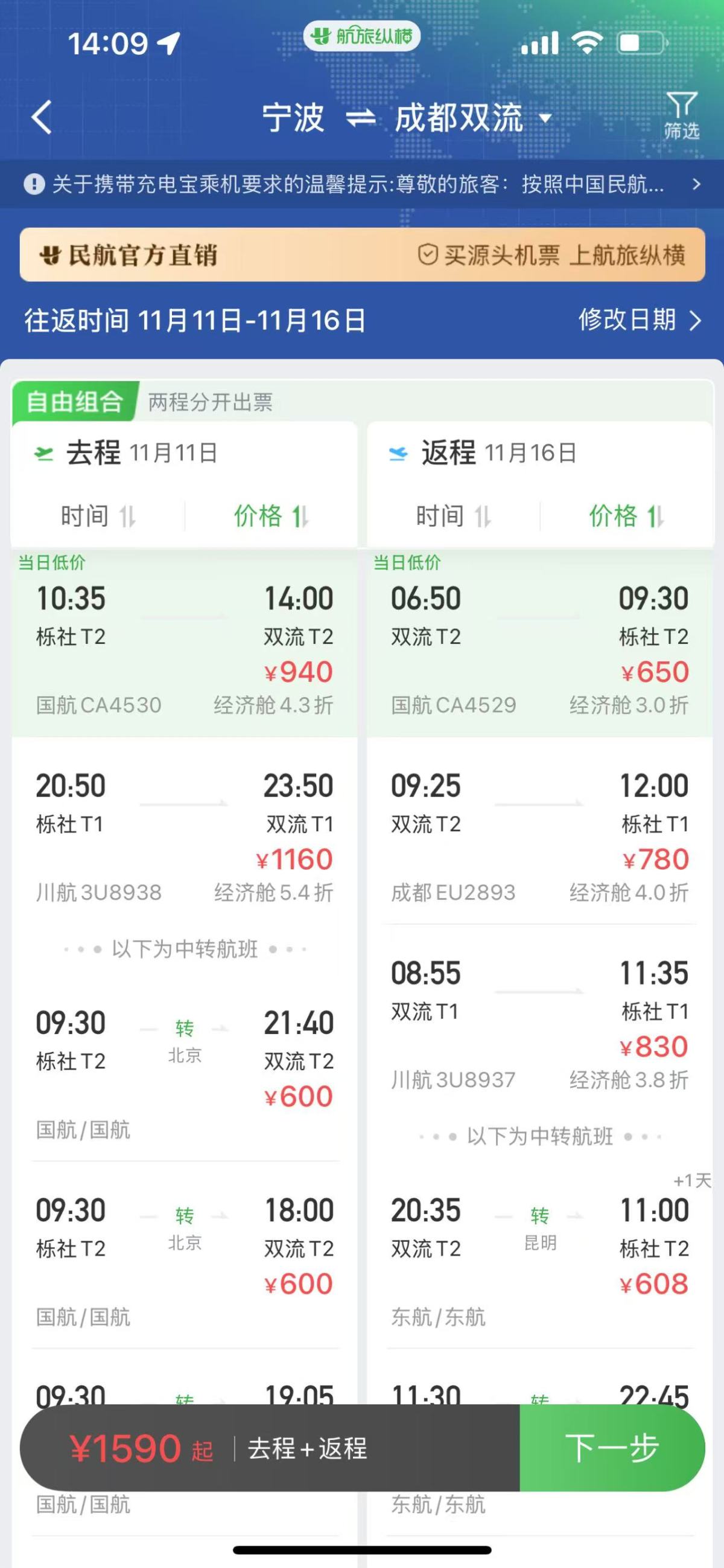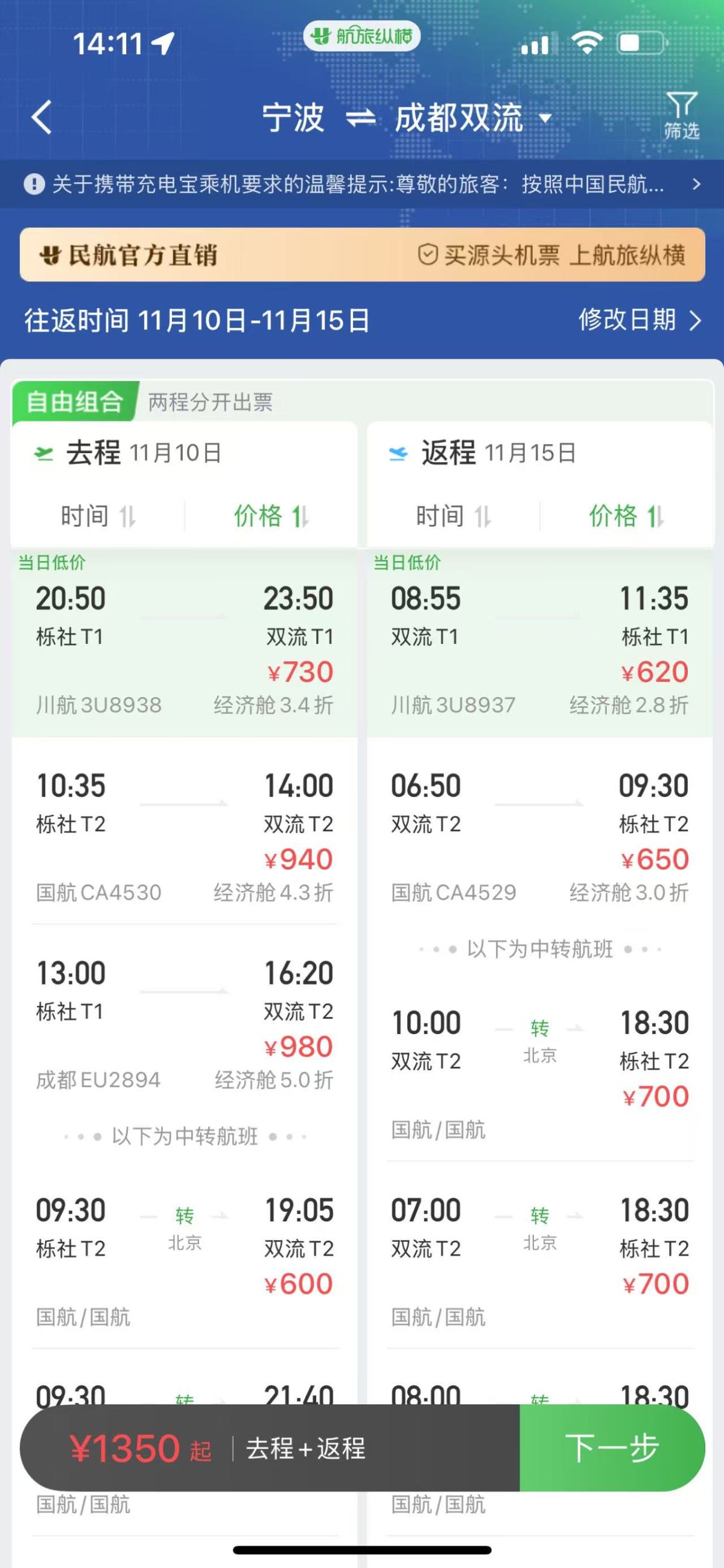宁波至成都的航线也有类似情况:11月10日宁波栎社机场20:50起飞、23:50抵达成都双流机场的航班,票价730元;11月11日晚同一航班、同一时间段,票价涨至1160元,单日涨幅达430元。