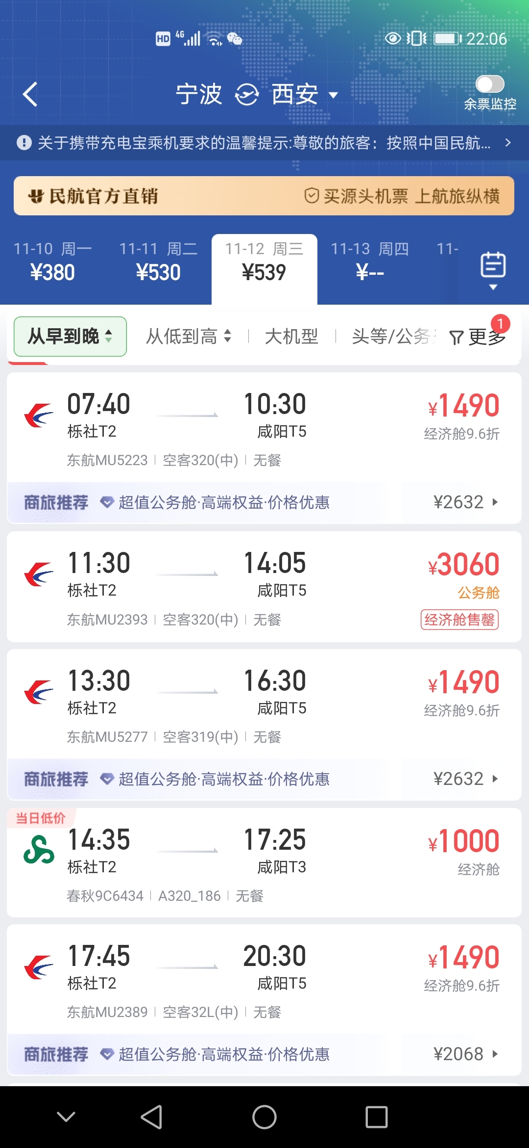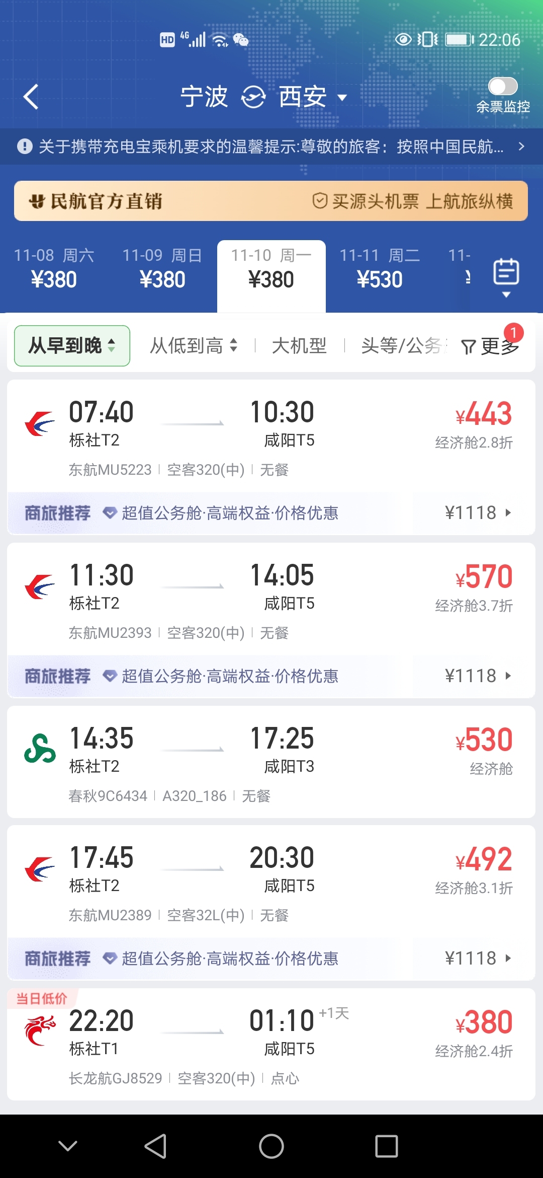 宁波去西安,机票的价格像“过山车”。机票预订截图