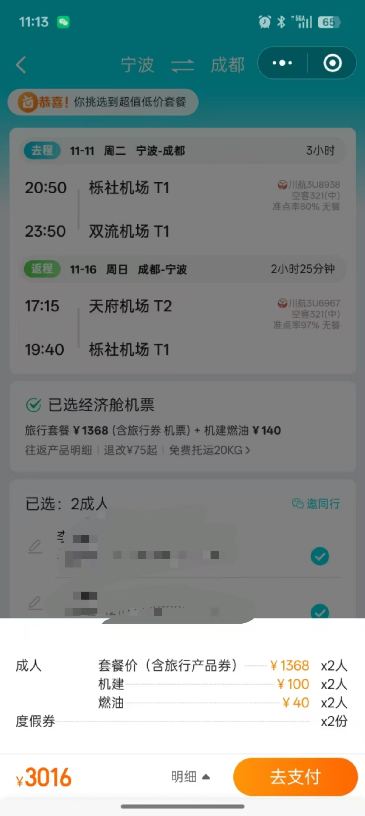 早在9月30日,他就看到网上流传的浙江可能推行春秋假的“小道消息”,没多犹豫便下单了两张宁波往返成都的机票,总票价3016元。