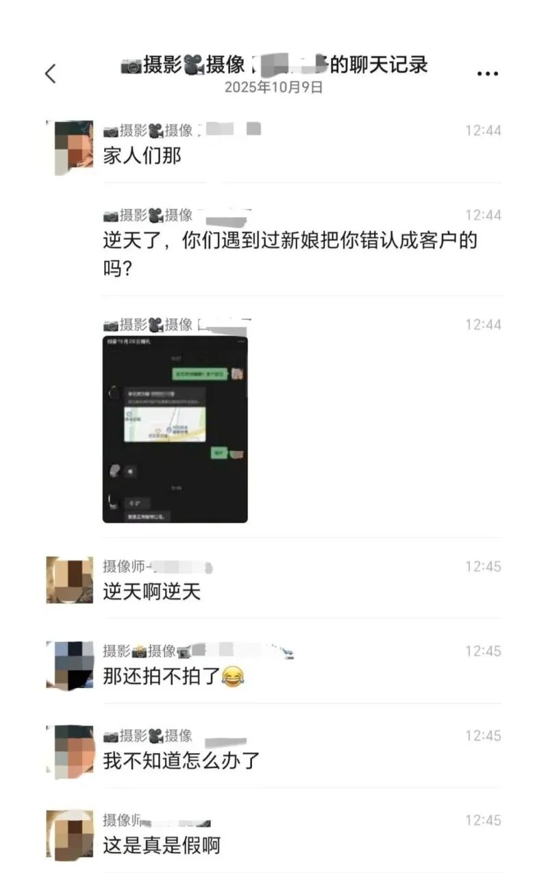 另一段群聊记录显示,有人自称当事摄影师,将聊天记录发到了同行聊天群内,引发热议,随后在网上流传开来。有人直呼“炸裂”,也有人对这一内容的真实性提出了质疑。