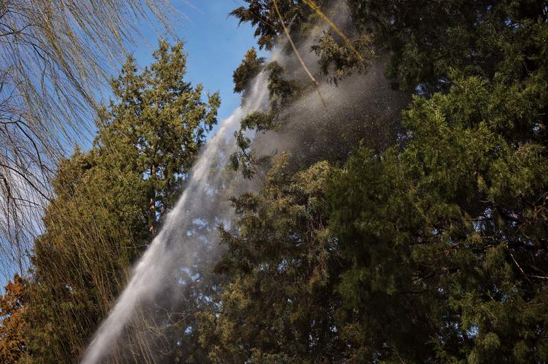 高压水枪喷洒到桧柏上,以减少花粉飘散量。资料图片/新京报记者 薛珺 摄