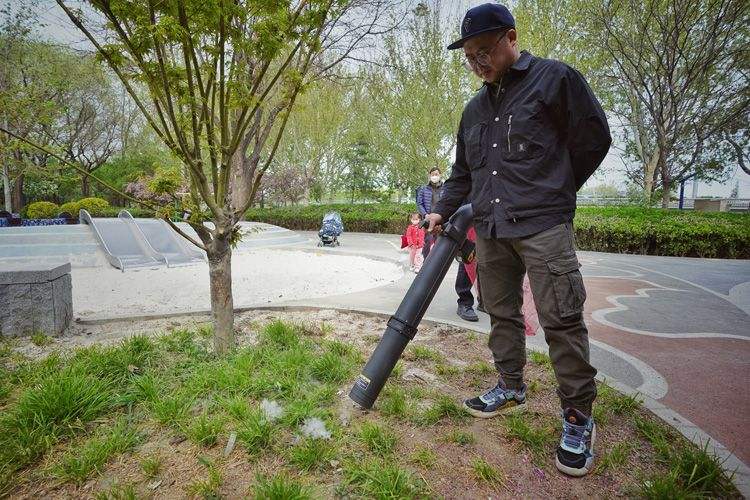 今年4月,轻便手提式杨柳飞絮吸收机开始在各公园试用。这款北京创新研发的吸收机形似吸尘器,长约一米,只有1.4公斤,可将落地的、边边角角的杨柳飞絮快速吸走。