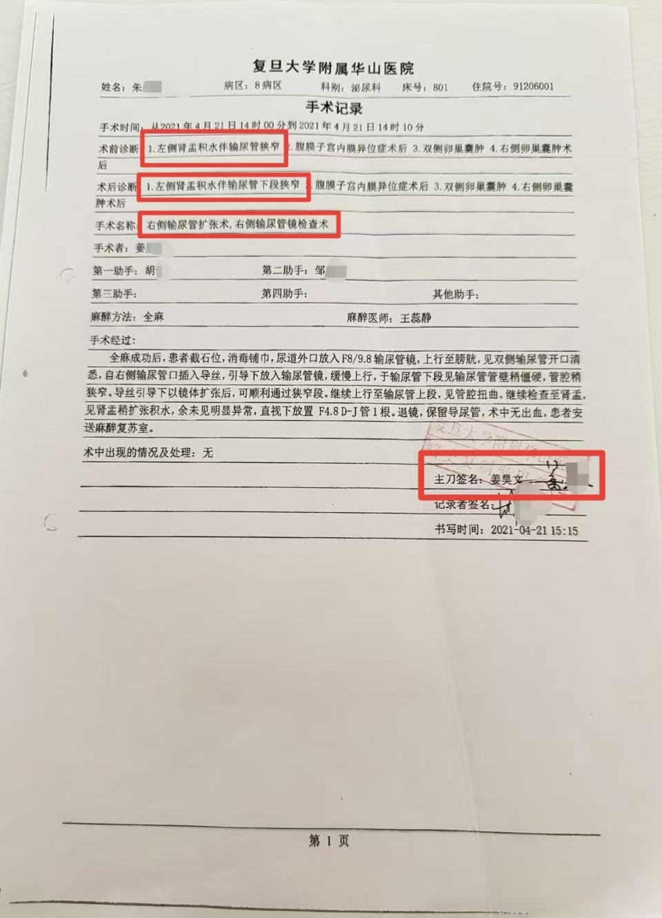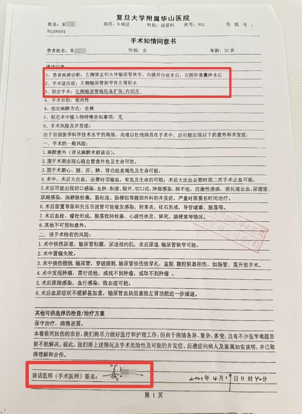 朱女士是江苏盐城人,而让其陷入维权泥淖的那台手术做于2021年4月,那年的朱女士30岁。日前,朱女士向华商报大风新闻记者讲述了事发经过。“我是在2021年体检时检查出左肾积水伴左输尿管狭窄的,当时也曾在我们盐城的医院做过一些治疗,但效果不是很好,就考虑到上海找权威一点的医生好好治疗一下。”朱女士介绍,2021年4月,她挂了复旦大学附属华山医院泌尿科一名主任医师的专家号,并在随后住进该院。