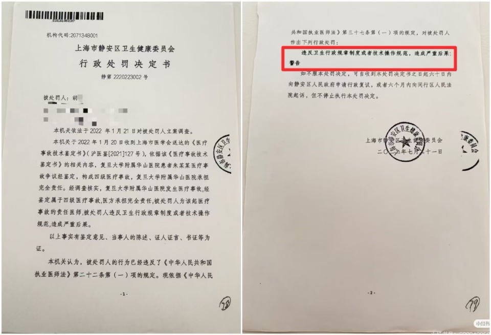 朱女士介绍,医疗事故鉴定结果做出后,2022年7月,静安区卫健委曾对涉事医生做出行政处罚。