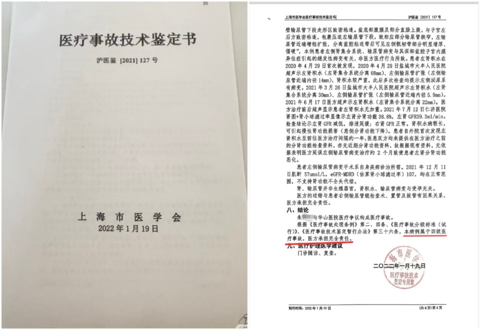 为了明确责任,朱女士向上海市静安区卫健委申请医疗事故鉴定,静安区卫健委移交上海市医学会组织鉴定。鉴定报告认定,华山医院虽然诊断正确,但手术方案有误,存在告知缺陷。2021年4月19日,医方手术知情同意书拟定手术为“左侧输尿管镜狭窄伴左肾积水”,4月21日,术中医方自行变更手术方案且依据不足(患者既往各项检查如超声、CTU、MR均提示泌尿系病变在左侧,术后超声检查亦显示病变在左侧),术中未向患方进行告知并取得患方知情同意,术后亦未告知患方该情况,患方至6月17日门诊复查时知晓该情况。医方告知存在缺陷,在一定程度上延误了患者左侧输尿管病变第二次治疗,时间约2个月。上海市医学会认为,朱女士与华山医院医疗争议构成医疗事故。根据相关规定和条例,认定本病例属于四级医疗事故,医方承担完全责任。