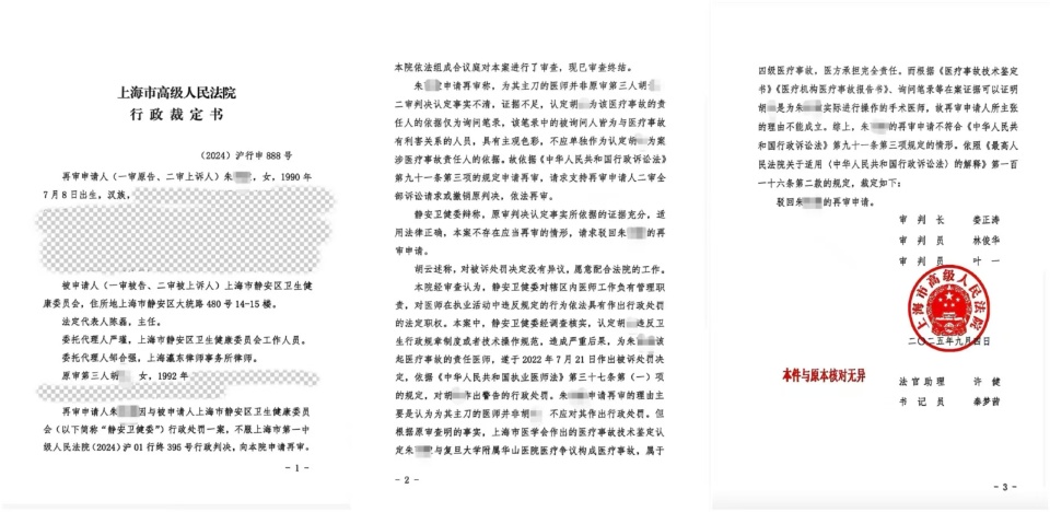 “卫健委仅仅给了当时手术的第一助手胡医生一个警告,对主刀医生没有任何处理。”朱女士说,处罚决定书中称,卫健委经调查,被处罚人胡医生是该起医疗事故的责任医师,违反卫生行政规章制度或者技术操作规范,造成严重后果,“但处罚措施仅是警告。”朱女士不服卫健委处罚,向当地法院提起行政诉讼,要求撤销相关处罚决定,对主刀医生做出处罚。但三级法院均认为,根据《医疗事故技术鉴定书》《医疗机构医疗事故报告书》、询问笔录等在案证据可以证明第一助手胡某是为朱女士实际进行操作的手术医师,故再审申请人所主张的理由不能成立,并先后做出驳回朱女士诉求的裁定。