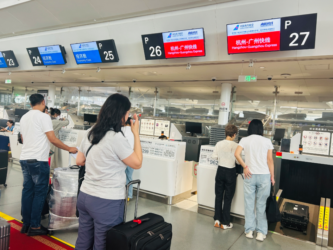 杭州萧山国际机场地勤公司值班主任李钢告诉记者,搭乘“杭州-广州”快线且无需行李托运的旅客,不受传统值机截止时间的限制,安检也设有精品快线的通道,方便大家快速出行。“如果旅客提前已经在线上完成值机,无需登机牌,只要扫脸或刷身份证,通过安检后即可去登机口乘机。”