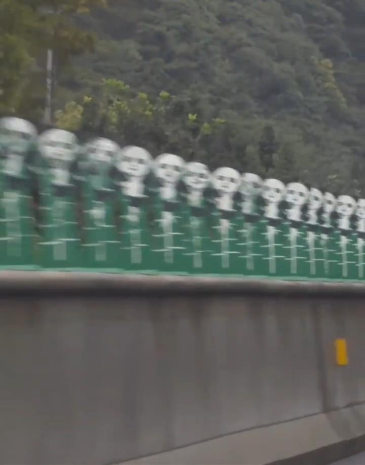 视频显示,车辆在高速公路行驶时,护栏上整齐排列着黑白绿配色的熊猫图案装置。由于车速快,装置快速闪过,形成一定的视觉冲击感。该装置疑似防眩板,网友纷纷留言评论“你不说,真不知道是熊猫,很像一款表情包”“眼睛都看花了”“正好,省得你打瞌睡”……