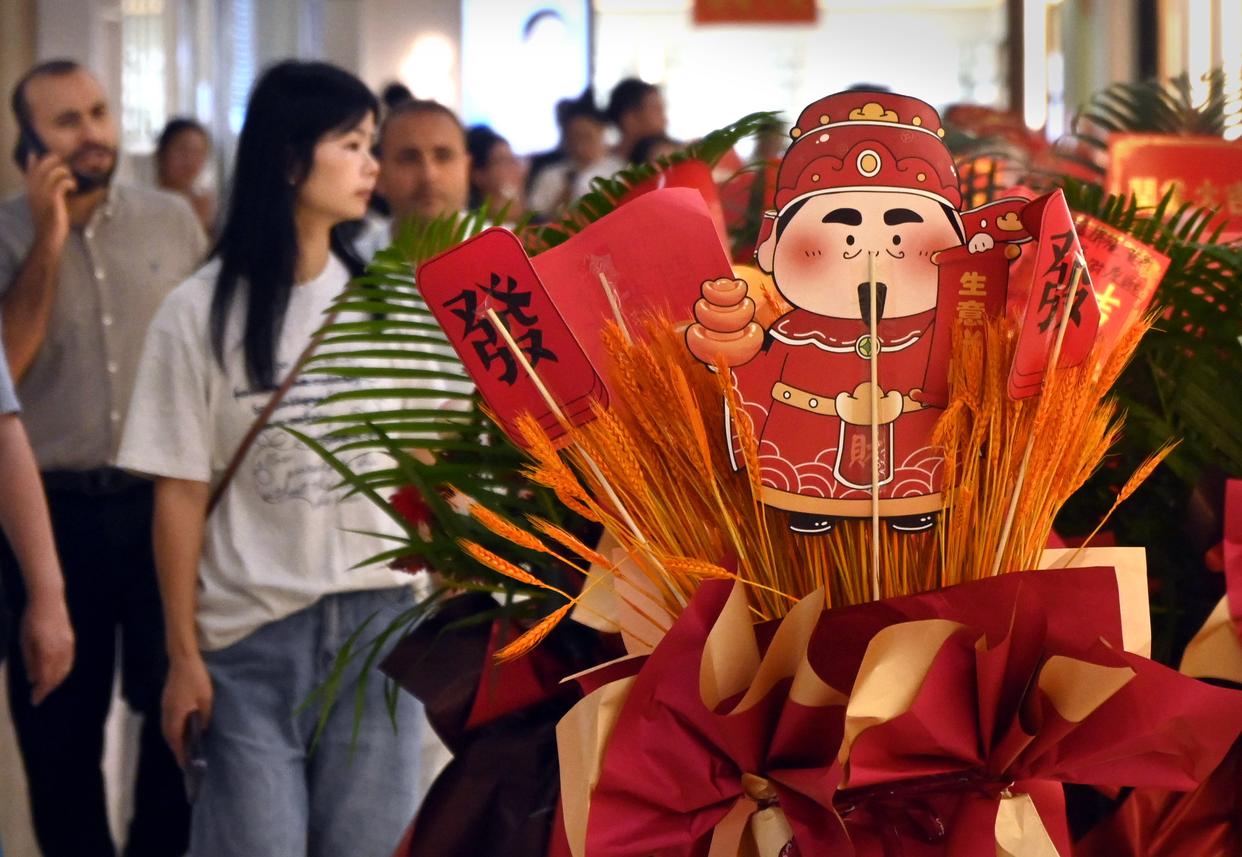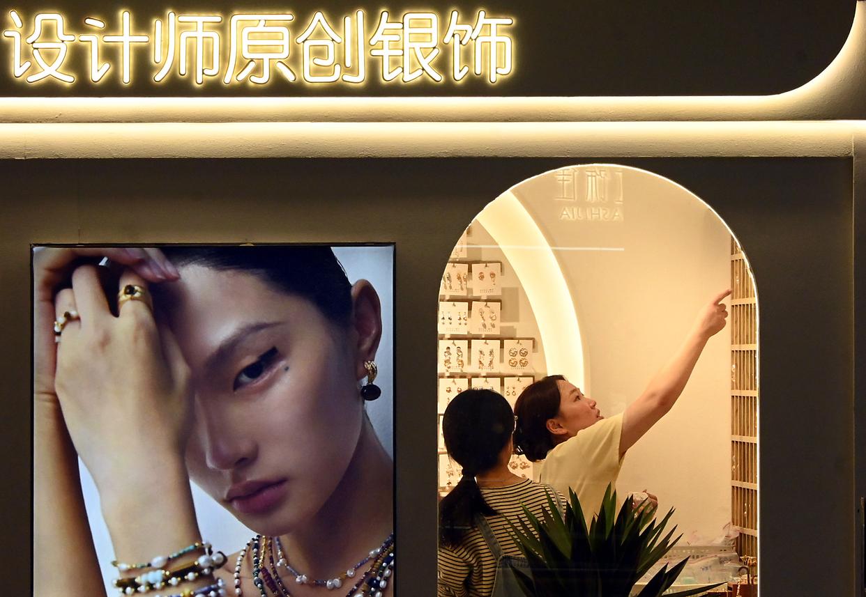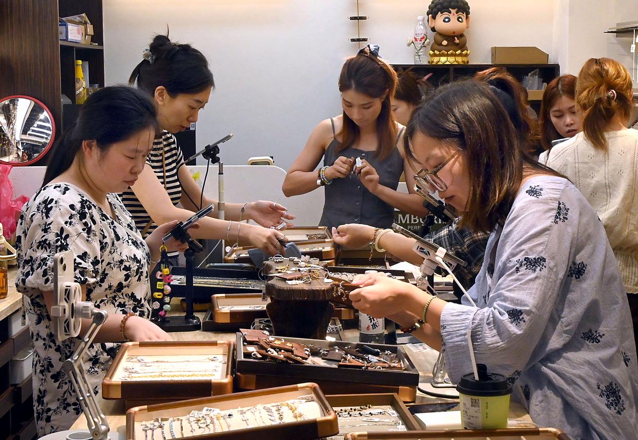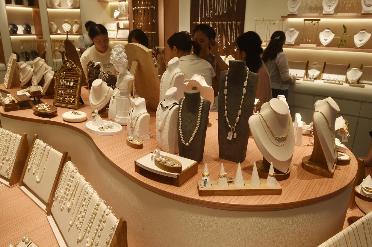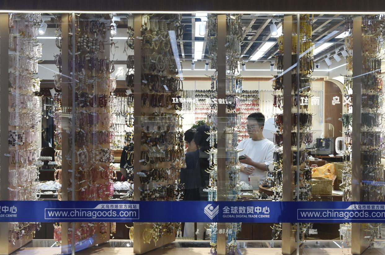 10月14日,游客在义乌国际商贸城一区市场内挑选首饰。新华社发(王颂 摄)