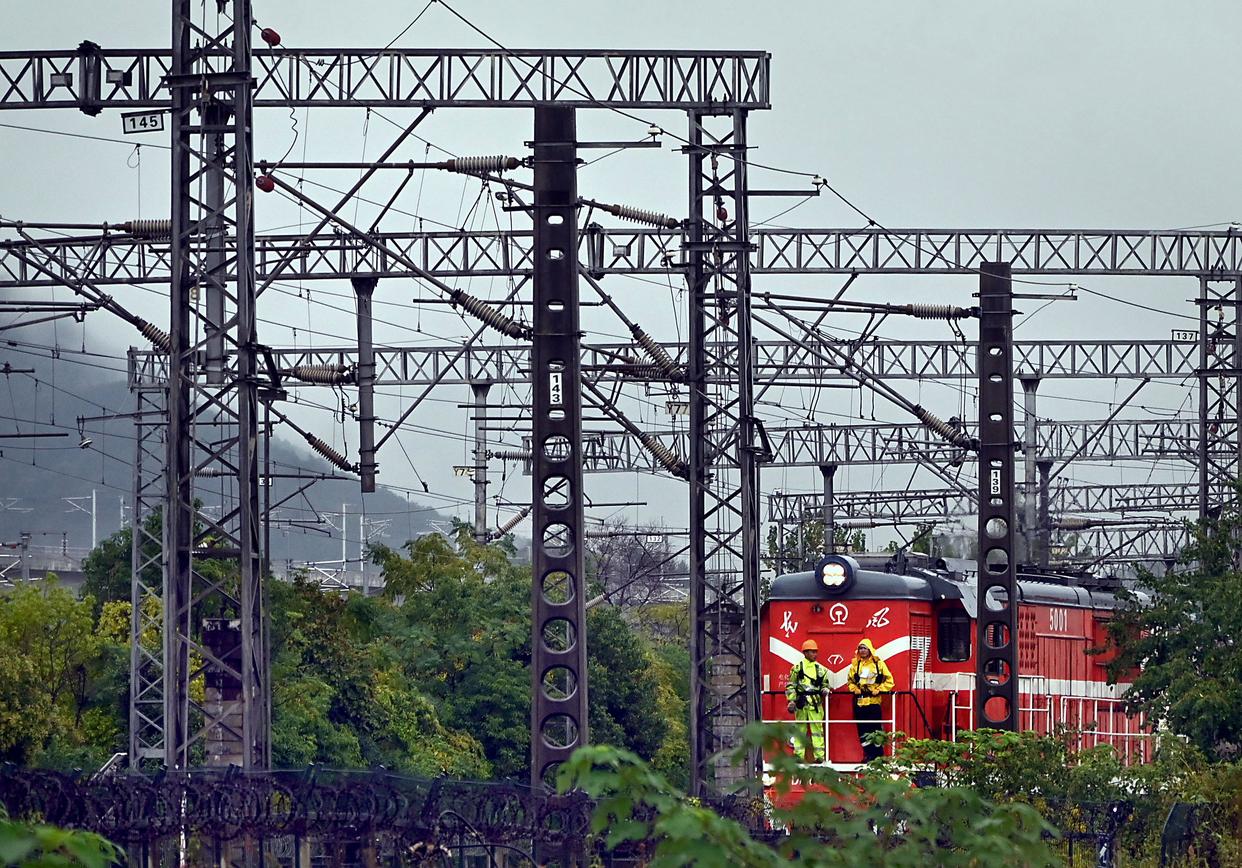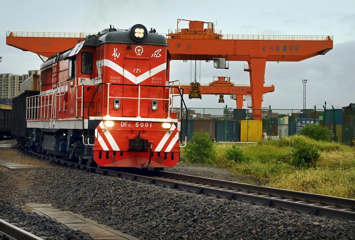 10月14日,一列牵引机车驶出义乌铁路口岸的站区,准备牵引开往中亚地区的货运专列。新华社发(王颂 摄)