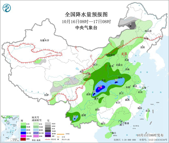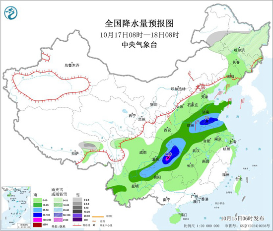 中国天气网讯 眼下,新一股较强冷空气正在影响我国,未来将横扫大江南北,大部地区将陆续迎来换季式降温。与此同时,冷空气南下与暖湿气流交汇,今起三天(10月15日至17日),华西至黄淮一带继续维持多雨格局,需持续警惕各类次生灾害。
