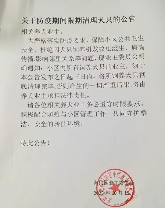 近日,网络流传一份限期清理犬只的公告,内容称“为严格落实防疫要求,保障小区公共卫生安全,杜绝因犬只饲养引发蚊虫滋生、病菌传播、影响邻里关系等问题,现业主委员会明确通知:小区内所有饲养犬只的业主,须于本公告发布之日起三日内,将所饲养犬只彻底清理完毕”等,落款为开平市海怡园住宅小区业主委员会,落款日期为2025年10月15日。