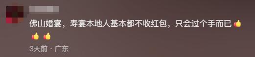 宗女士将视频发到网上后,引发网友热议,有网友表示,“我顺德的,我每次的100红包,送了20次,都还没送出,还放在车上”,也有网友表示,“佛山婚宴,寿宴本地人基本都不收红包,只会过个手而已”,还有网友提到,“我也想去吃一次广东人的酒席,先说明我不是蹭饭吃,纯粹是想感受一下20的红包吃一次酒席的那种氛围”。