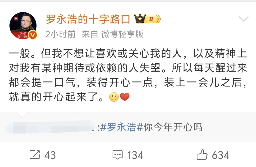 10月15日晚,有网友问罗永浩,你今年开心吗?10月16日下午,罗永浩转发微博,回复网友称:“一般。但我不想让喜欢或关心我的人,以及精神上对我有某种期待或依赖的人失望。所以每天醒过来都会提一口气,装得开心一点,装上一会儿之后,就真的开心起来了。”