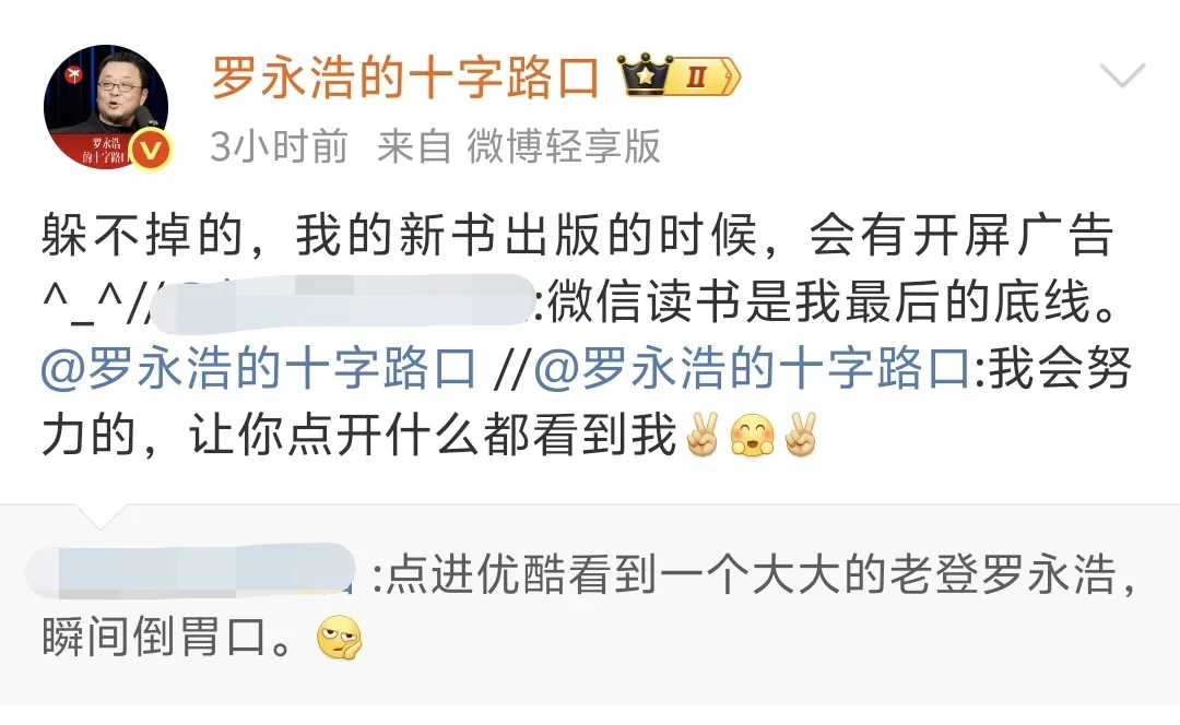 此外,还有网友称,点进优酷看到一个大大的罗永浩,瞬间倒胃口。罗永浩转发微博,回复称“我会努力的,让你点开什么都看到我。”