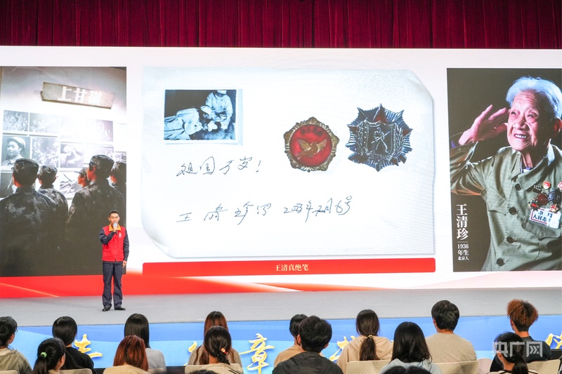 思政课上,王清珍的孙子刘航站上了宣讲台,将奶奶的青春故事娓娓道来。1950年,年仅14岁的王清珍参军入伍,五个月后主动请缨赴朝参战。在上甘岭的坑道里,这个还没有枪高的女兵每天要照顾20多名重伤员。最忙的时候,她连续七天没有睡过安稳觉。“哪怕牺牲,也要把伤员照顾好。”这个信念支撑着她在炮火中坚守。