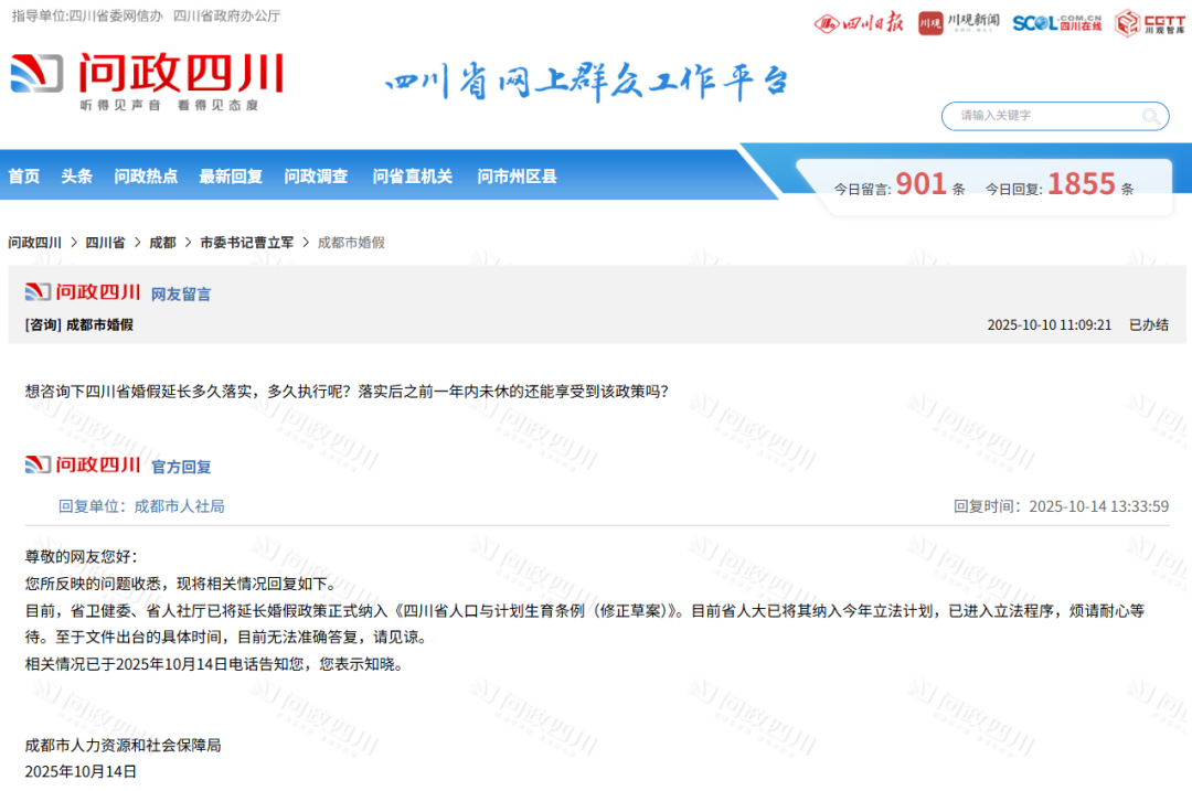 10月14日,成都市人力资源和社会保障局发布回应:目前,省卫健委、省人社厅已将延长婚假政策正式纳入《四川省人口与计划生育条例(修正草案)》。目前省人大已将其纳入今年立法计划,已进入立法程序,烦请耐心等待。至于文件出台的具体时间,目前无法准确答复,请见谅。