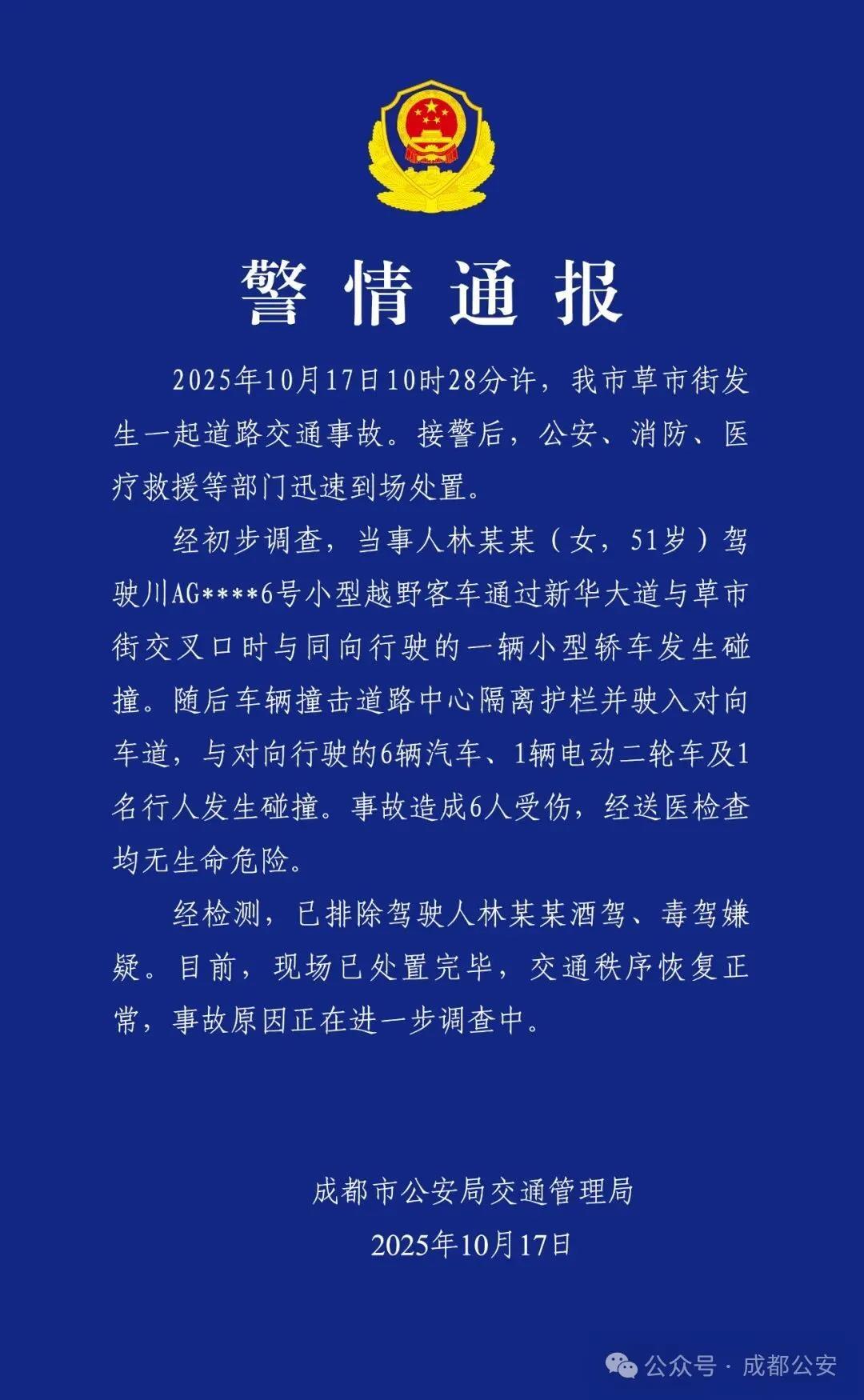 10月17日上午,四川省成都市草市街发生一起道路交通事故,导致6人受伤,造成事故的涉事车辆驾驶员为51岁女子林某某。