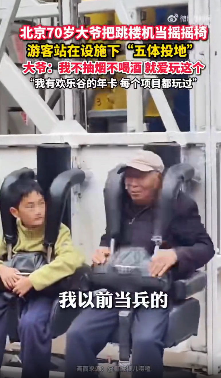 10月16日,北京,70岁大爷喜欢玩跳楼机,坐上去的动作十分熟练,看呆邻座小孩哥。