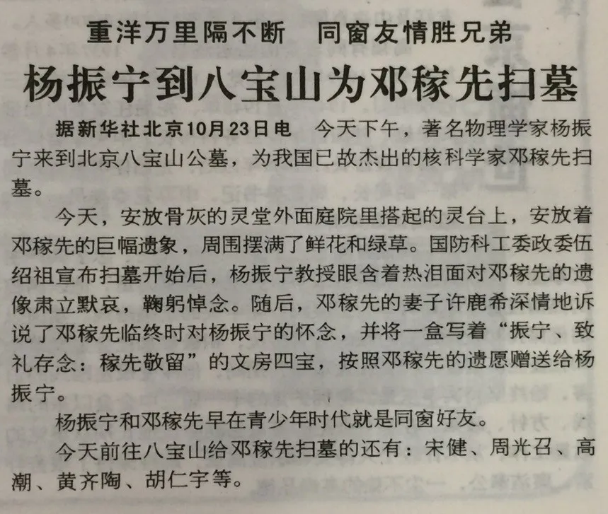 《人民日报》1987年10月24日刊发新华社报道《重洋万里隔不断 天窗友情胜兄弟 杨振宁到八宝山为邓稼先扫墓》。
