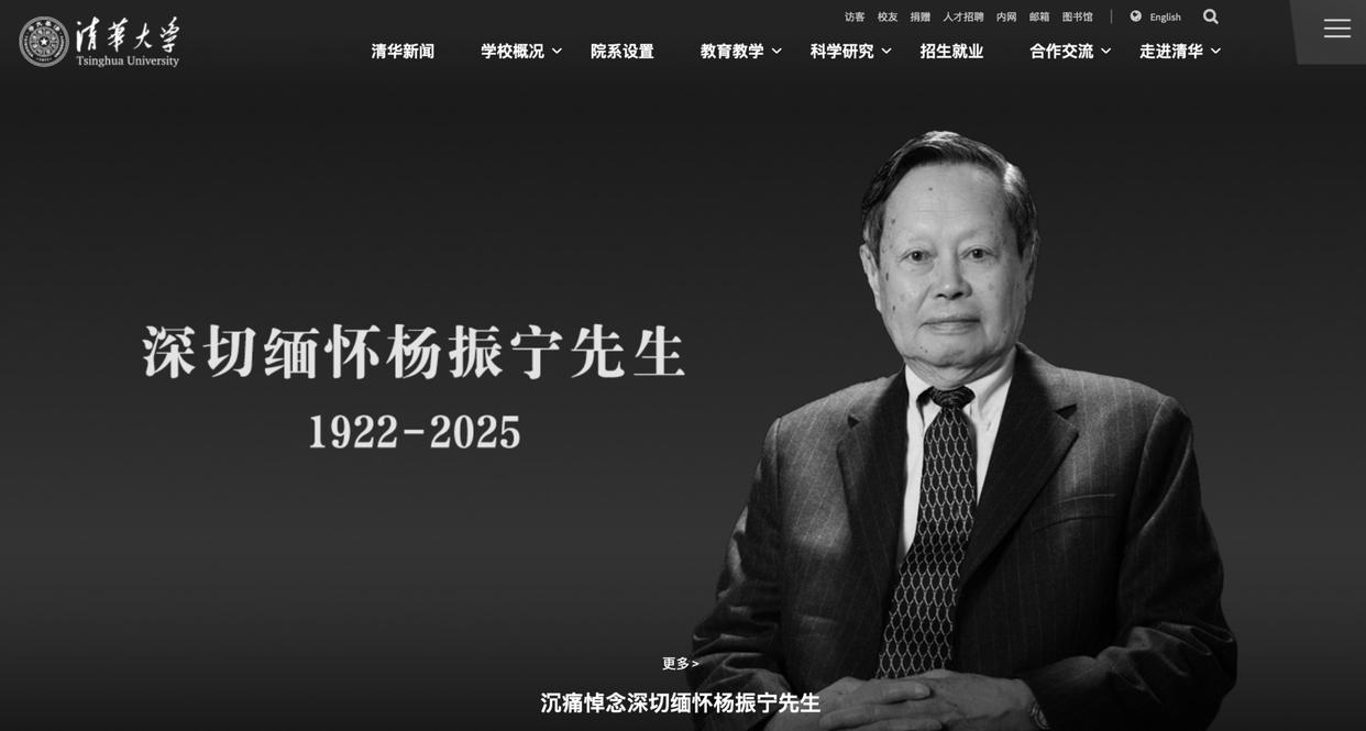 这一天,距离杨振宁先生103岁寿辰,仅过去不到30天。同日12时19分,清华大学官网发布缅怀杨振宁先生的《讣告》。此后,清华大学官网页面已变为黑白。