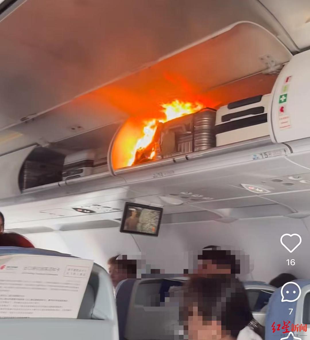 据潮新闻报道,有搭乘该趟航班的网友发帖称,当时,整个客舱都是烟,行李架都熏黑了,“本来还在飞机上啃面包,突然‘砰’一声就看到前面行李架火冒出来了。”
