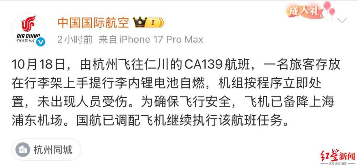 10月18日12时39分,中国国际航空发布情况通报,称当日由杭州飞往仁川的CA139航班,一名旅客存放在行李架上的手提行李内锂电池自燃,机组按程序立即处置,未出现人员受伤。为确保飞行安全,飞机已备降上海浦东机场。国航已调配飞机继续执行该航班任务。