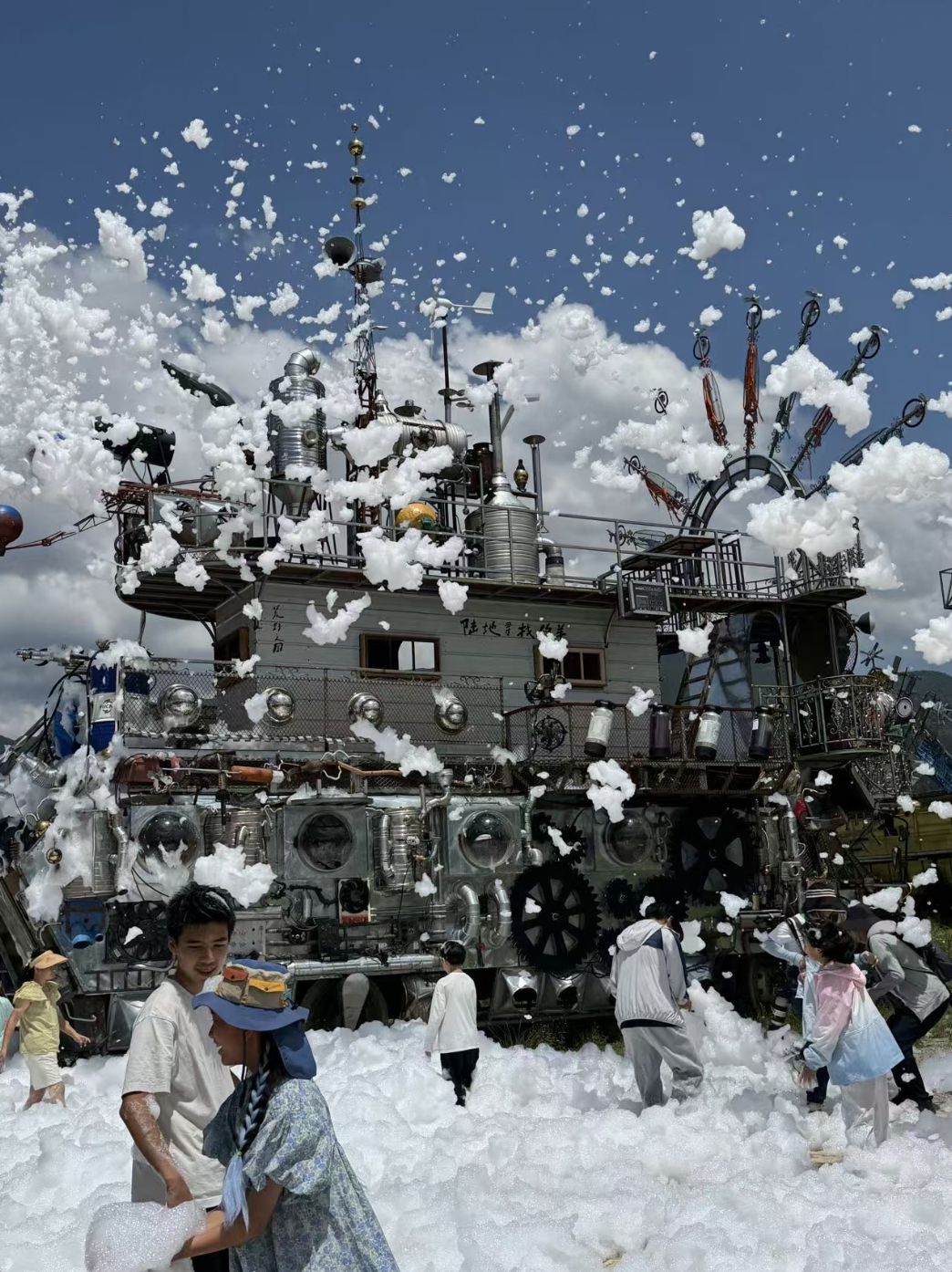 在《梁虫》作品完成之前,只有梁龙的头部,我们制作成了3米高的立体装置,内部安装了电瓶动力,可以在路上开动。这件作品还参加了2024年阿那亚戏剧节,备受好评。后来把头部增加了千竹虫的身体,近年9月份,梁龙还亲自来荒野之国,为这件作品拍照打卡。他个人非常的喜欢这件作品,还开玩笑地说,因为这件作品,他最近又火了。