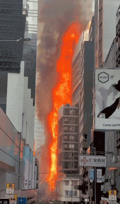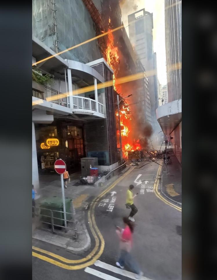 今天(18日)下午4点左右,香港中环干诺道中34-37号华懋大厦后巷,一大楼外棚架起火,火乘风势直攻而上,大厦陷入火海,浓烟席卷半空,一度传出爆炸声。