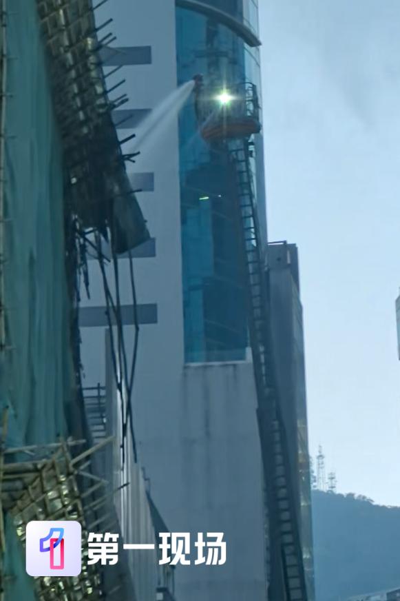 下午6点,记者在现场看到,大楼已无明火和浓烟,空气中也没有烟味。一台超高云梯车仍在高空向起火位置持续洒水。
