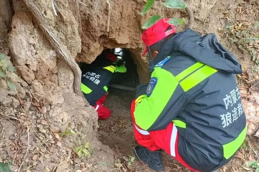 搜救现场,队员进入一处土洞内查看(央广网发 赤峰狼途应急救援中心供图)