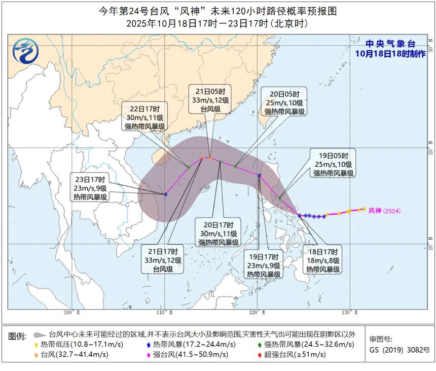 预计“风神”今天白天将在菲律宾吕宋岛东部沿海登陆,此后穿过吕宋岛,明天下午到夜间进入南海东部海面。进入南海后因为有冷空气南下对它形成压制,在低层东北气流引导下,台风逐渐转向西南方、强度减弱,最后可能在南海消亡。受冷空气和“风神”的共同影响,18日20时至19日20时,台湾以东洋面、台湾海峡、巴士海峡、南海北部和中部、西沙群岛和中沙群岛附近海域、北部湾、台湾沿海、福建沿海、广东沿海、海南岛东部沿海将有6-8级大风,阵风9-10级,其中台湾海峡、台湾西部沿海、福建沿海和南海中部偏东海域风力有9级,阵风10-11级。10月18日