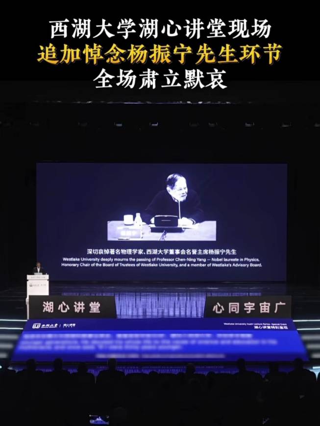 10月18日下午,西湖大学湖心讲堂《时空的史诗:从奇点到永恒》天文专场,临时追加悼念杨先生环节,全场肃立默哀。