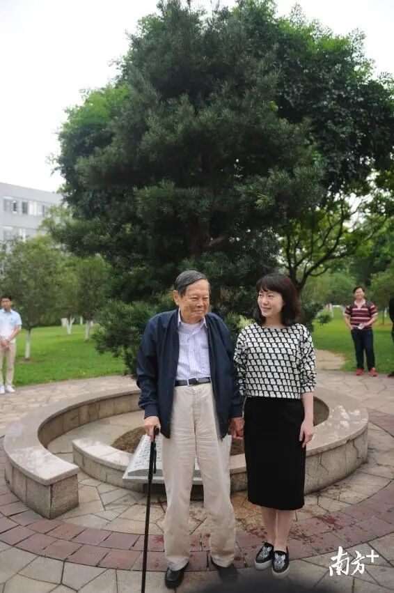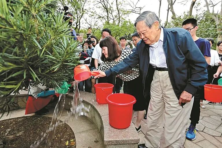 杨振宁伉俪为亲植的罗汉松浇水。(图来自东莞理工学院微信公众号)