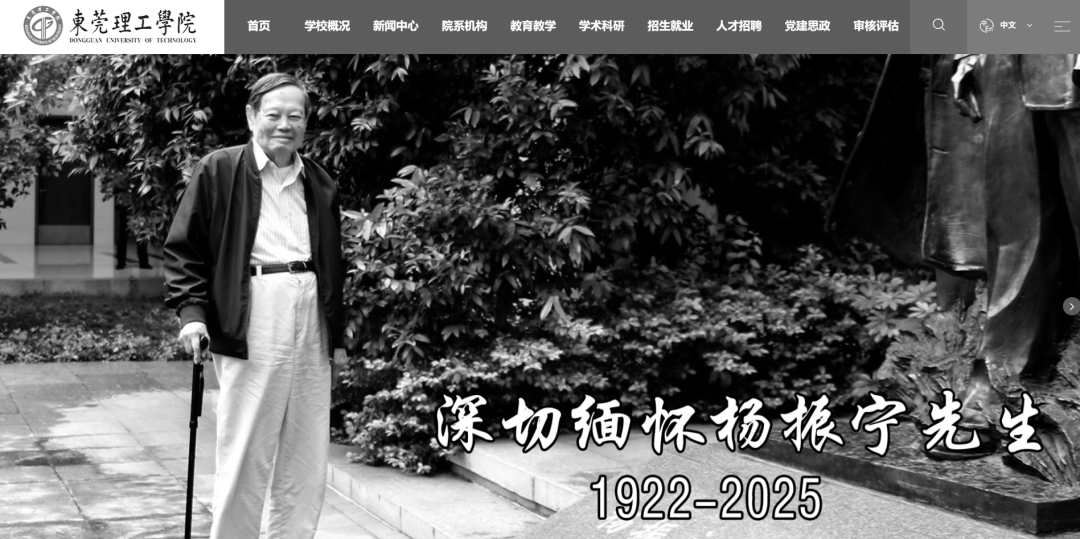 杨振宁逝世的消息传来后,东莞理工学院的官方网站和官方微信公众号均变成了黑白色。