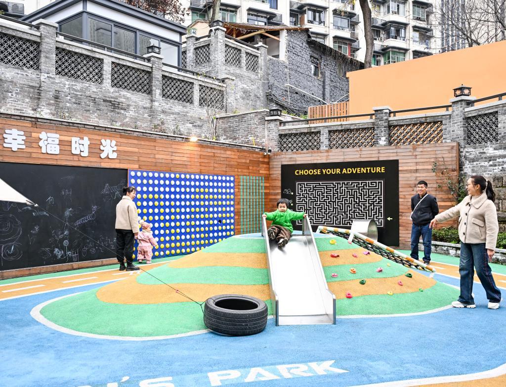 居民和小朋友在重庆市江北区大石坝街道忠恕沱社区的一口袋公园休闲、玩耍。