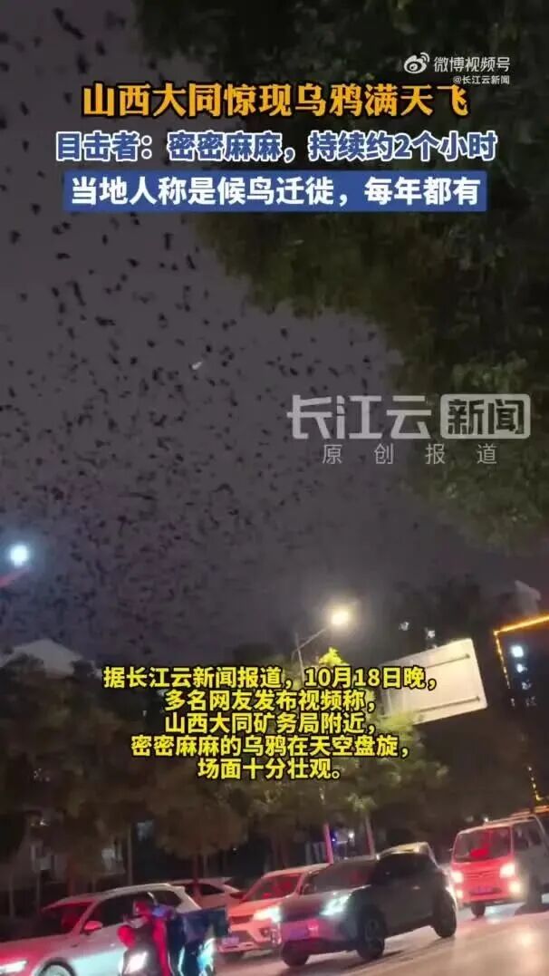 10月18日晚,多名网友发布视频称山西天同矿务局附近,密密麻麻的乌鸦在天空盘旋,场面十分壮观。