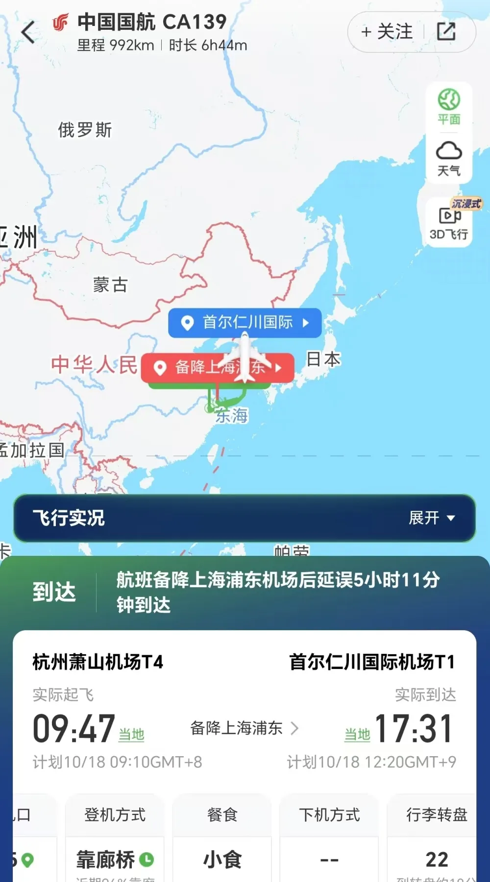 界面新闻查询第三方平台获悉,CA139航班于10月18日早上9点47分从杭州萧山机场起飞,后来备降上海浦东机场,并于17点31分达到韩国首尔仁川国际机场。其间延误超过5个小时。