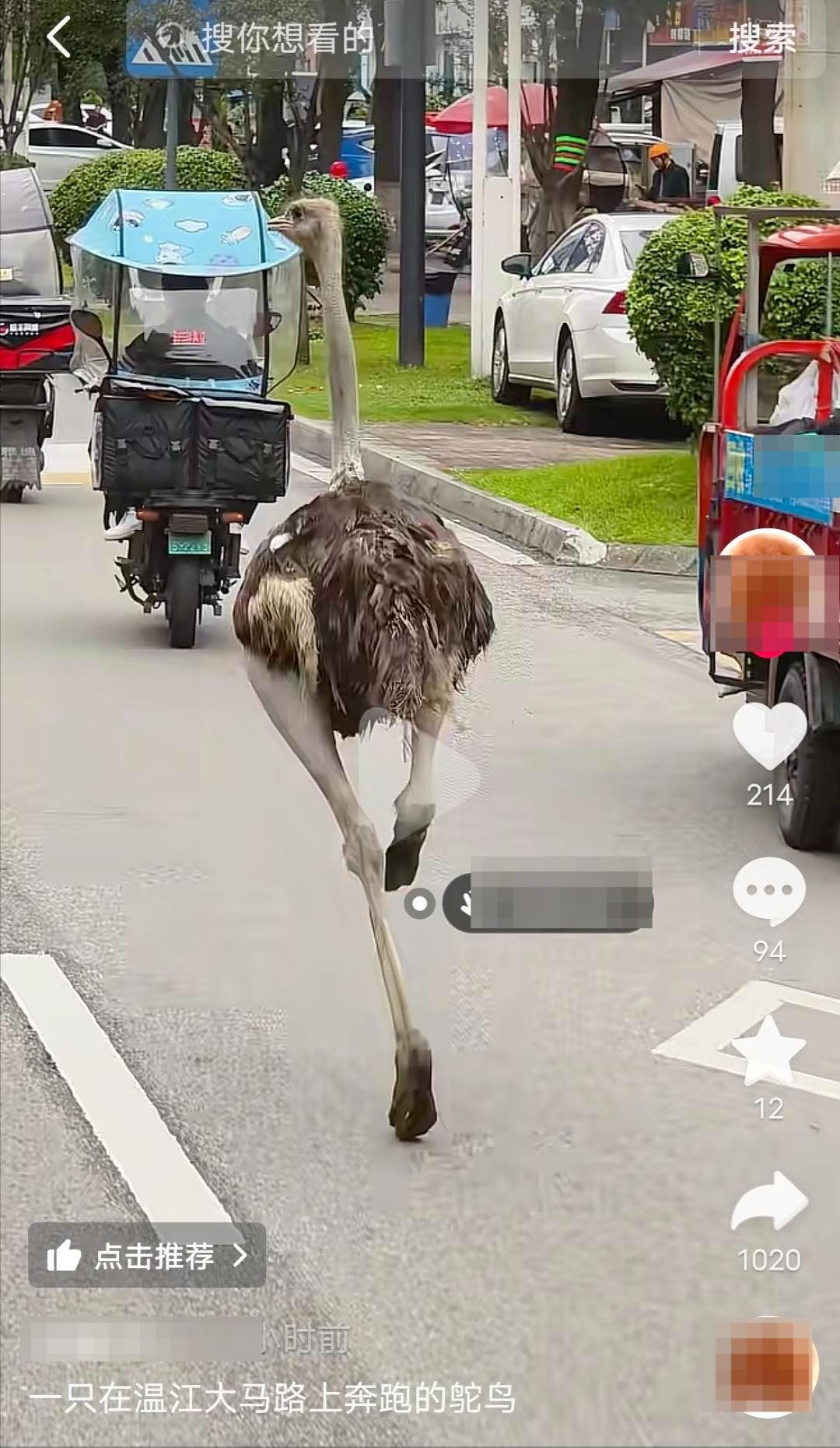 10月19日,一段鸵鸟在马路上奔跑的视频在网上引发关注。有网友称,视频中的场景出现在19日上午的成都温江大学城,一共有两只鸵鸟“出逃”,目前均已被“抓获”。
