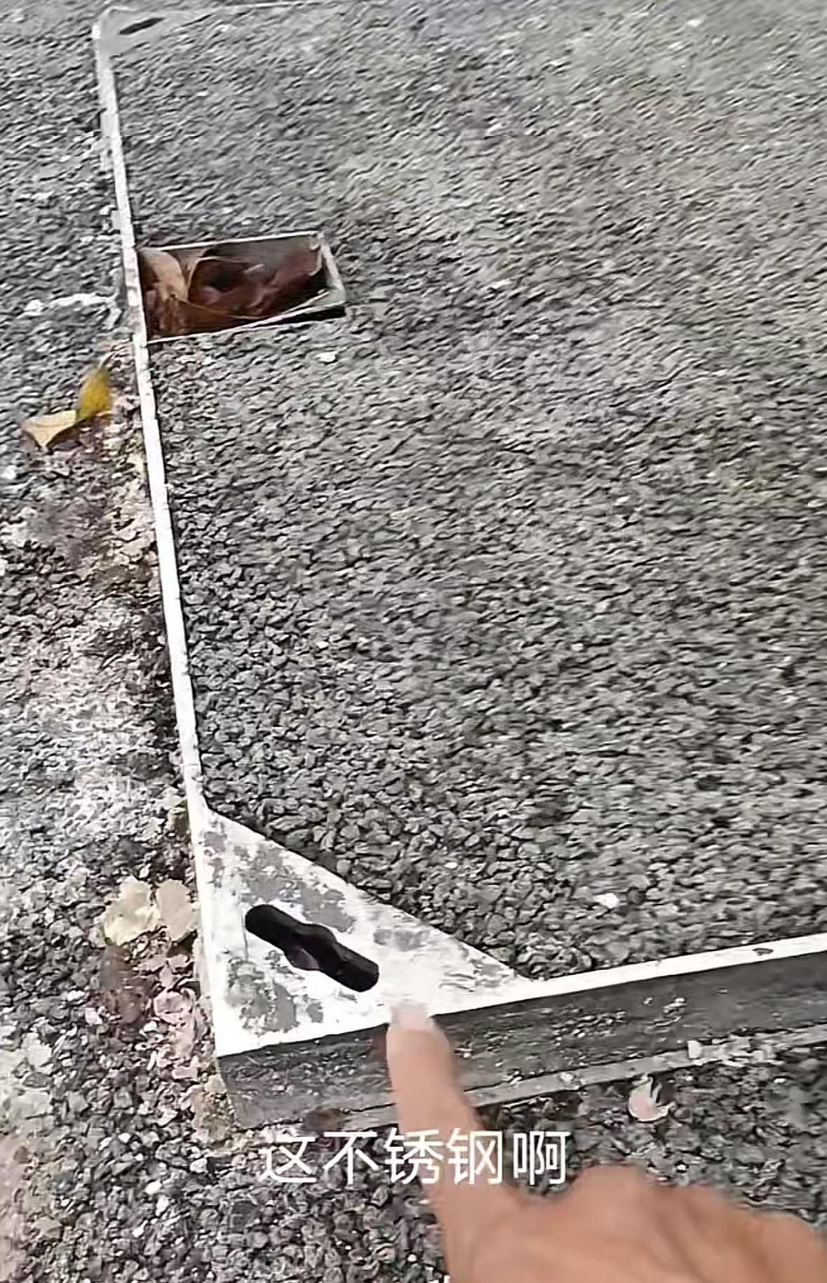 此后不久他又拍了一个“没盖好的井盖”,“可能是搞排污或者修路的撬开了,又不好好放回去。”他用一把卷尺测量出井盖比路面高出5厘米,而井盖四角是尖锐的不锈钢。
