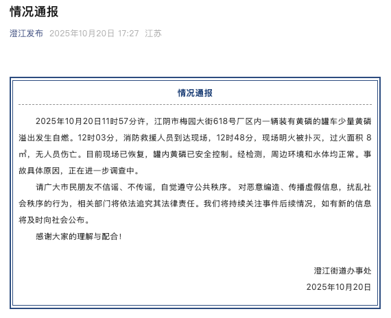 2025年10月20日11时57分许,江阴市梅园大街618号厂区内一辆装有黄磷的罐车少量黄磷溢出发生自燃。12时03分,消防救援人员到达现场,12时48分,现场明火被扑灭,过火面积 8㎡,无人员伤亡。目前现场已恢复,罐内黄磷已安全控制。经检测,周边环境和水体均正常。事故具体原因,正在进一步调查中。
