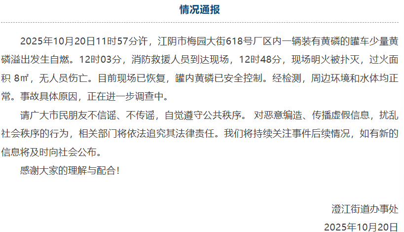 据通报,2025年10月20日11时57分许,江阴市梅园大街618号厂区内一辆装有黄磷的罐车少量黄磷溢出发生自燃。12时03分,消防救援人员到达现场,12时48分,现场明火被扑灭,过火面积8㎡,无人员伤亡。目前现场已恢复,罐内黄磷已安全控制。经检测,周边环境和水体均正常。事故具体原因,正在进一步调查中。