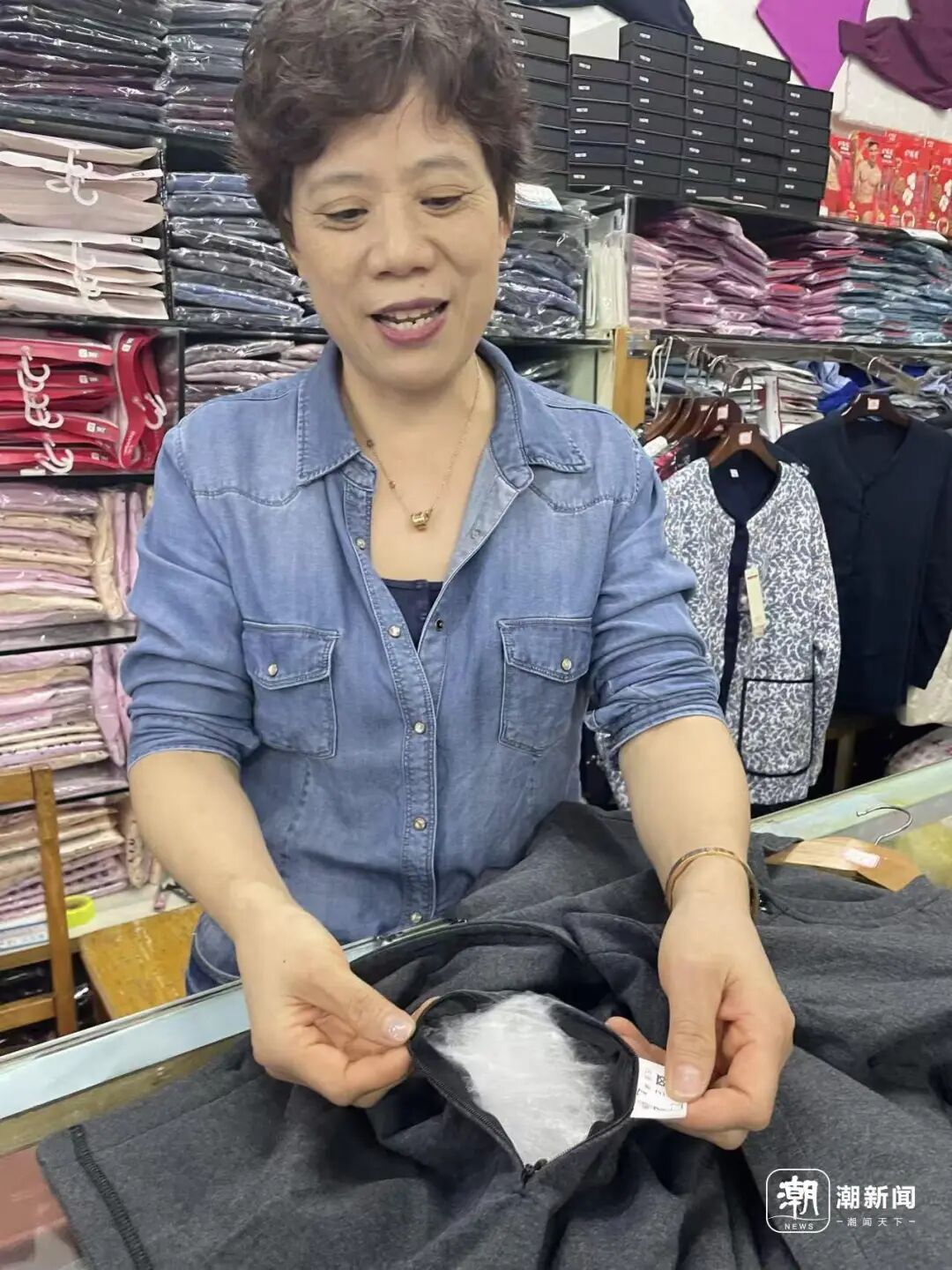 穿着牛仔衣、戴着项链的沈国女站在柜台眼观六路,耳听八方,活力满满。她27岁起就在豫丰祥上班,看一眼顾客,就能准确地判断合适的尺码,推荐最适合的款式、颜色,因此很多老头老太都认准小沈买丝绵壳。