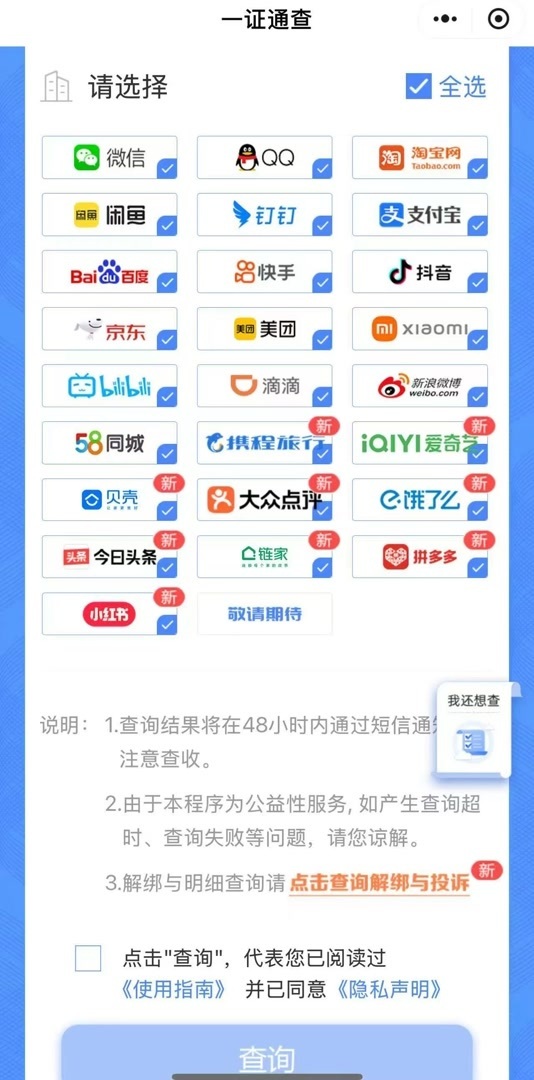 在“一证通查”操作页面还设有“点击查询解绑与投诉”选项,点击后可按指引跳转浏览器对相关平台账号进行解绑操作。不过,目前尚不支持“一键解绑”,只能逐个手动操作。