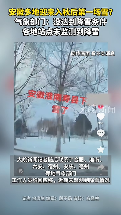 随后,记者联系了合肥、淮南、六安、宿州、安庆、亳州等地气象部门,工作人员均回应称,近期未监测到降雪情况。