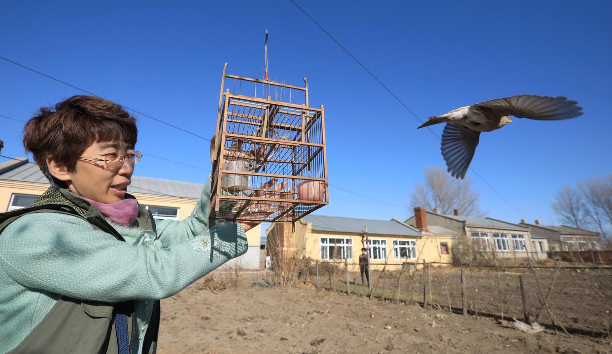 哈尔滨野保志愿者团队志愿者管绍贤在呼兰区放飞被捕鸟类(2019年11月2日摄)。新华社发(张树摄)