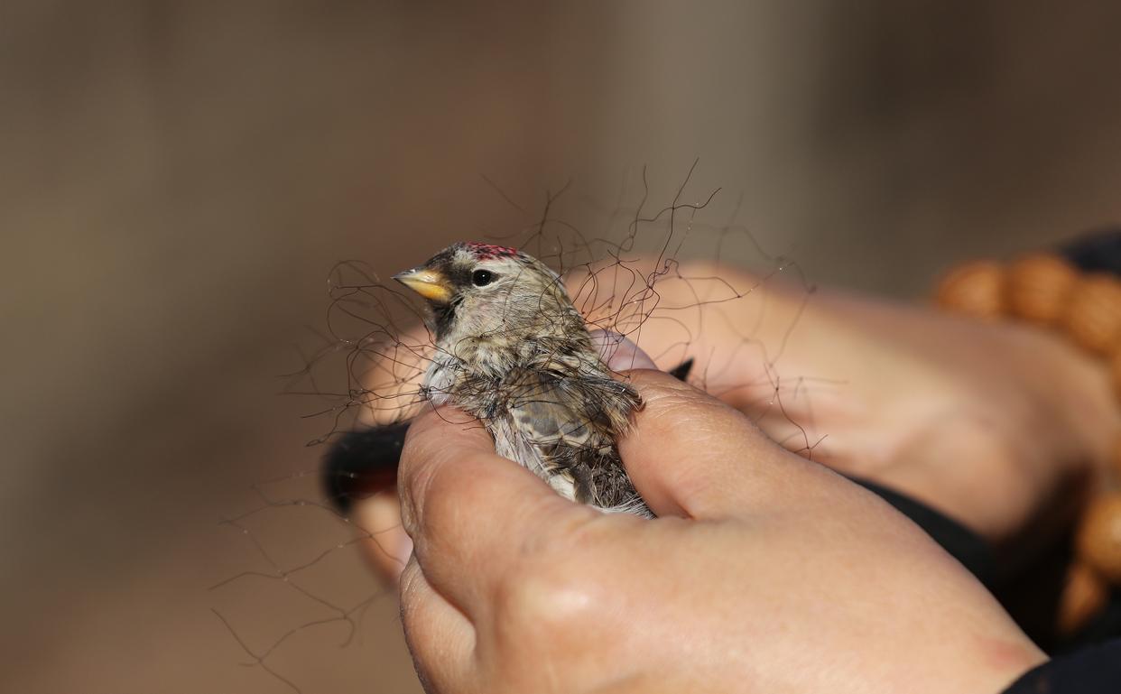 哈尔滨野保志愿者团队志愿者在剪掉缠在白腰朱顶雀身上的鸟网(2019年11月2日摄)。新华社发(张树摄)