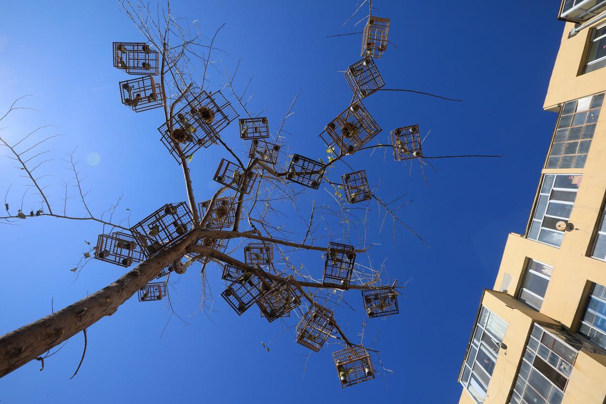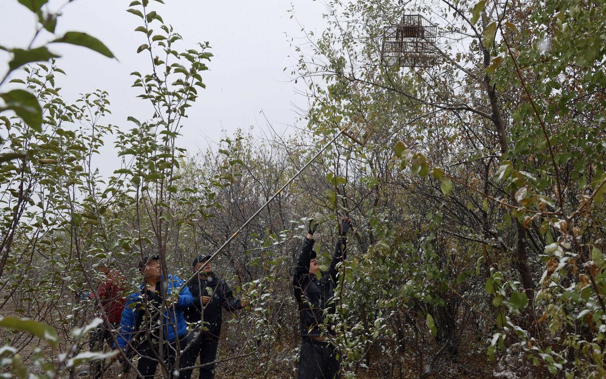 2025年10月19日,哈尔滨野保志愿者团队志愿者在野外摘下挂在树上的捕鸟滚笼及诱笼。新华社发(张树摄)
