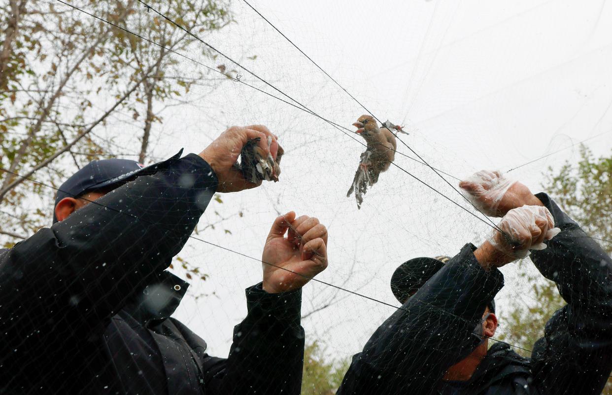 2025年10月19日,哈尔滨野保志愿者团队志愿者在救助被捕鸟网粘住的鸟类。新华社发(张树摄)