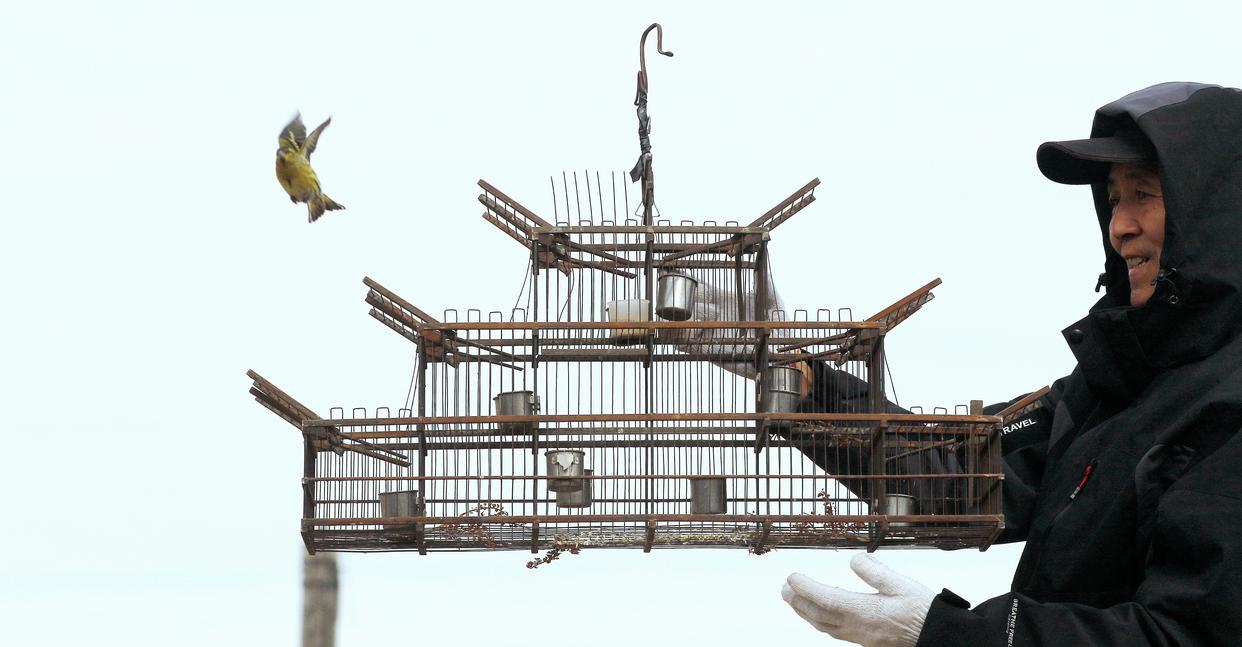 哈尔滨野保志愿者团队志愿者放飞被捕鸟笼捕获的鸟类(2023年11月4日摄)。新华社发(张树摄)